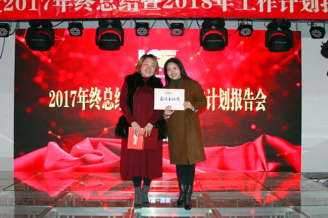 龍平芳女士為獲得“最佳責任獎”部門頒發(fā)證書